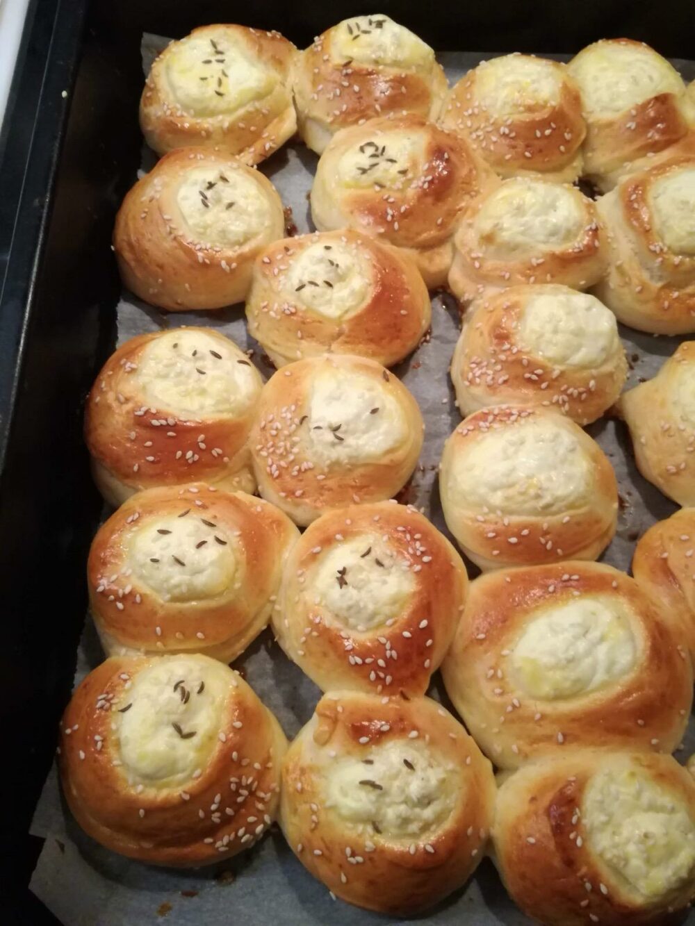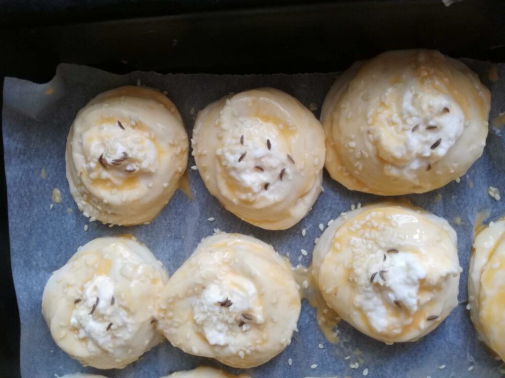 Udubljenja napunite pripremljenim sirom. Peciva premažite žumancetom i pospite susamom.