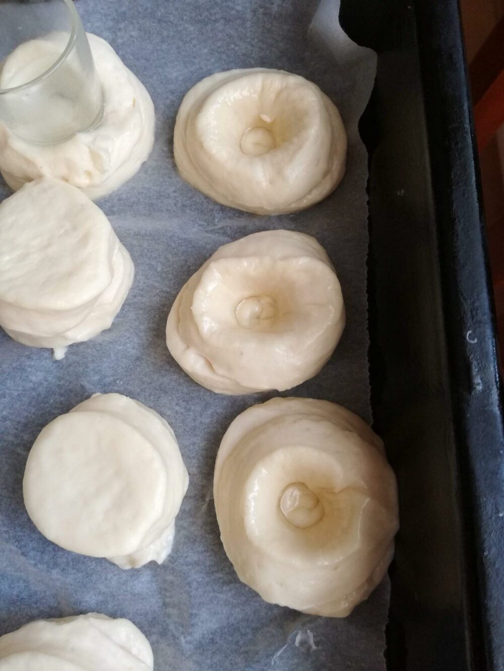 Ostavite peciva još 15 minuta da dodatno narastu. Nakon toga, pomoću male čaše napravite udubljenje u sredini svakog komada, vodeći računa da čašu prethodno umočite u ulje kako se tijesto ne bi lijepilo.